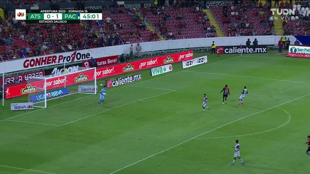 Tiro atajado Por arriba en el centro del arco. Jordy Caicedo (Atlas) disparo de cabeza desde el centro del área. Asistencia de Martín Nervo pase largo.