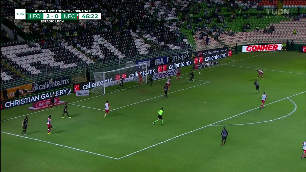 Tiro atajado. Jorge Aguilar (Necaxa) Disparo con la derecha desde más de 30 metros.