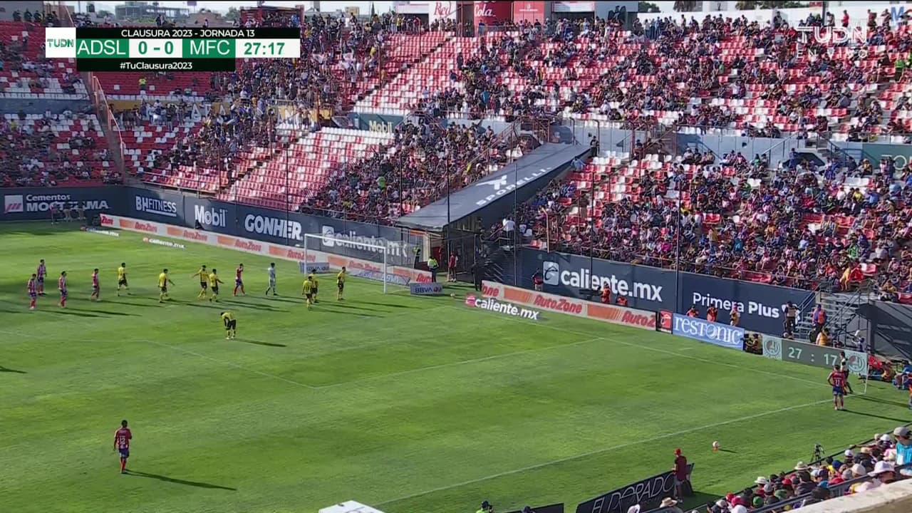 Tiro atajado al ángulo superior derecho. José García (Atlético San Luis) disparo de cabeza desde el centro del área. Asistencia de Dieter Villalpando con un centro al área.