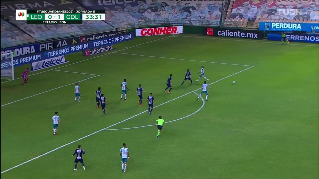 Tiro atajado raso al centro del arco. José Macías (Chivas ) Disparo con la derecha desde el centro del área. Asistencia de Jesús Molina.