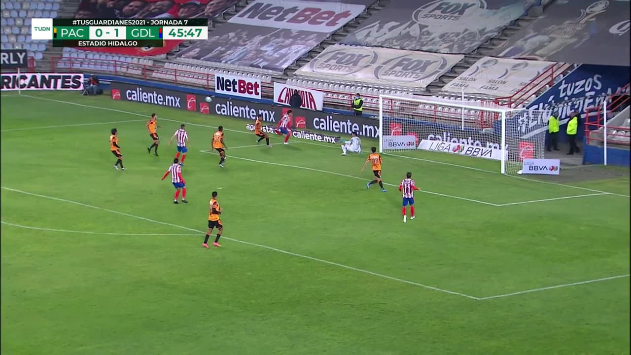 Tiro atajado. José Macías (Chivas ) Disparo con la derecha sin ángulo desde la izquierda.
