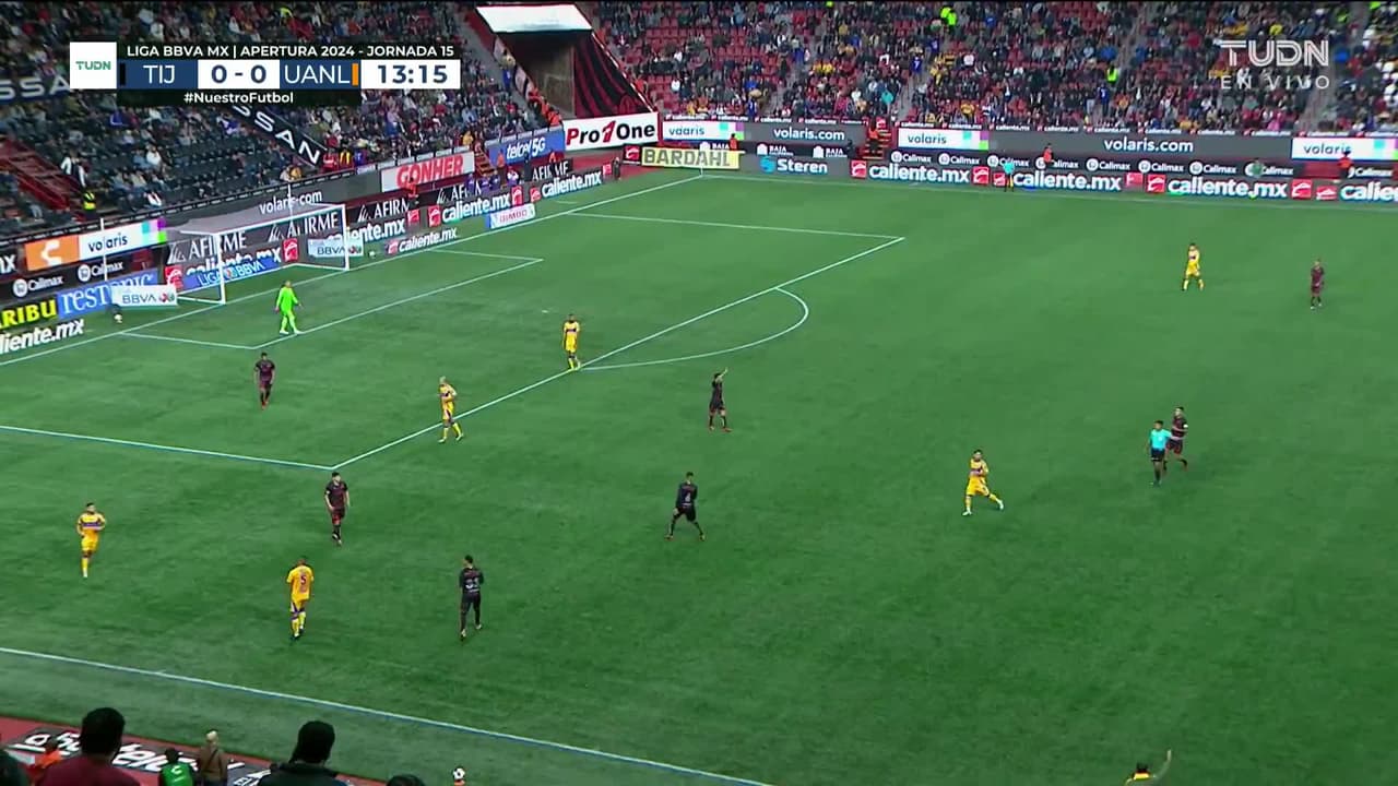 Tiro atajado. Juan Brunetta (Tigres) zurdazo desde el lado izquierdo dentro del área.