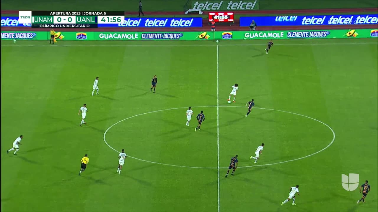 Tiro atajado. Juan Dinenno (Pumas UNAM) zurdazo desde el centro del área.