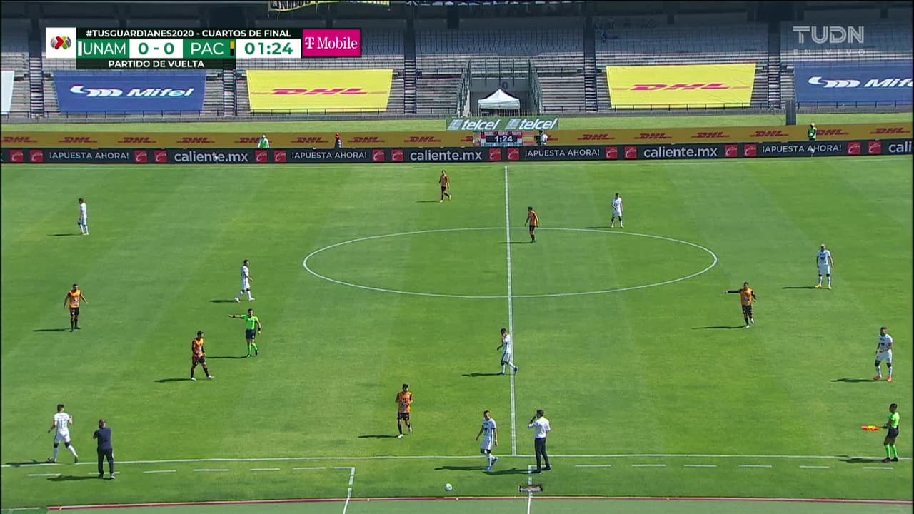 Tiro atajado. Juan Ignacio Dinenno (Pumas UNAM) Disparo con la derecha desde fuera del área.