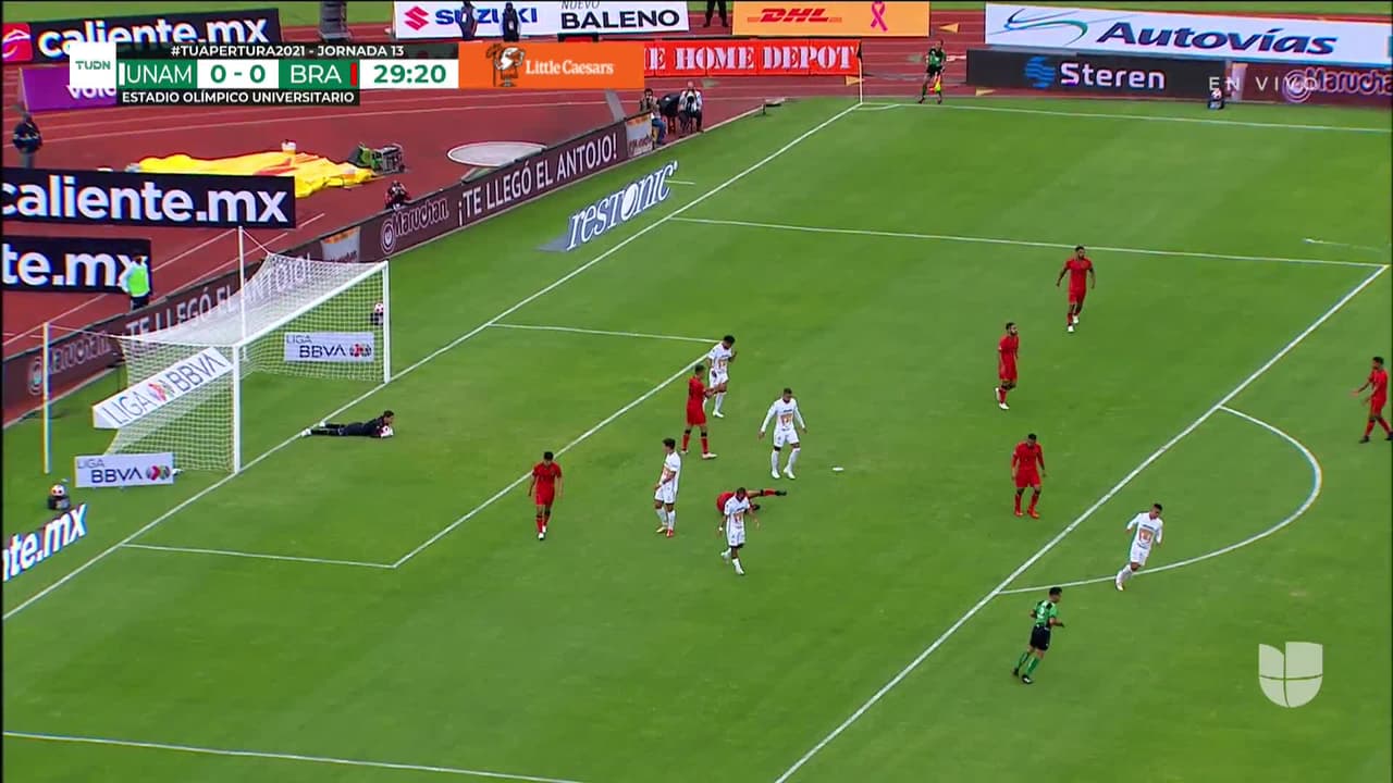 Tiro atajado raso al centro del arco. Juan Ignacio Dinenno (Pumas UNAM) disparo de cabeza desde el centro del área. Asistencia de Alan Mozo con un centro al área.