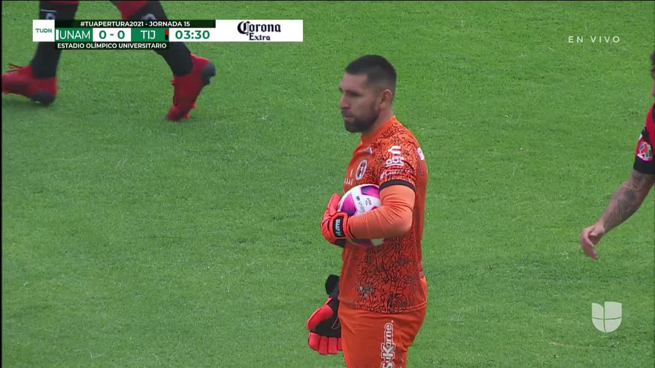 Tiro atajado raso al centro del arco. Juan Ignacio Dinenno (Pumas UNAM) Disparo con la derecha desde el centro del área. Asistencia de Efraín Velarde pase largo.