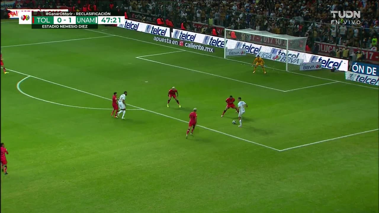 Tiro atajado. Juan Ignacio Dinenno (Pumas UNAM) Disparo con la derecha desde el centro del área.
