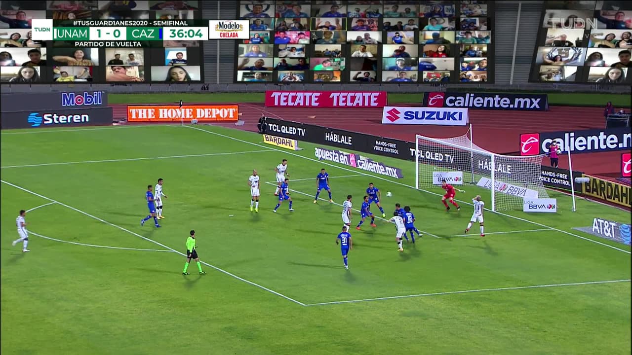 Tiro atajado raso al centro del arco. Juan Iturbe (Pumas UNAM) zurdazo a quemarropa desde el lado derecho.