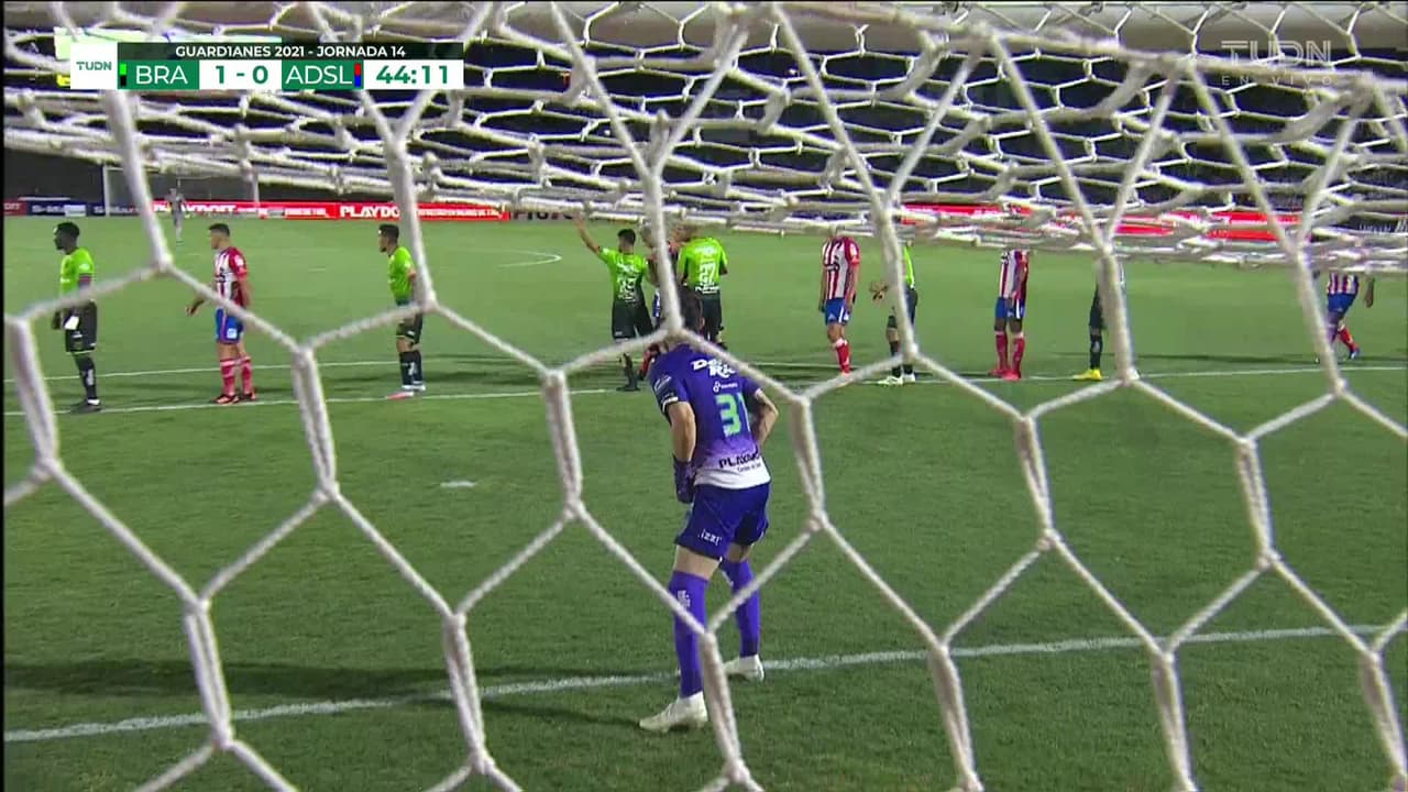 Tiro atajado al ángulo superior derecho. Juan Izquierdo (Atlético San Luis) disparo de cabeza desde el centro del área. Asistencia de Juan Castro con un centro al área.