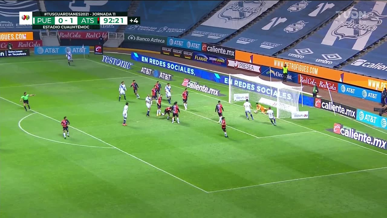 Tiro atajado Por arriba en el centro del arco. Juan Pablo Segovia (Puebla) disparo de cabeza desde el centro del área. Asistencia de Javier Salas con un centro al área.