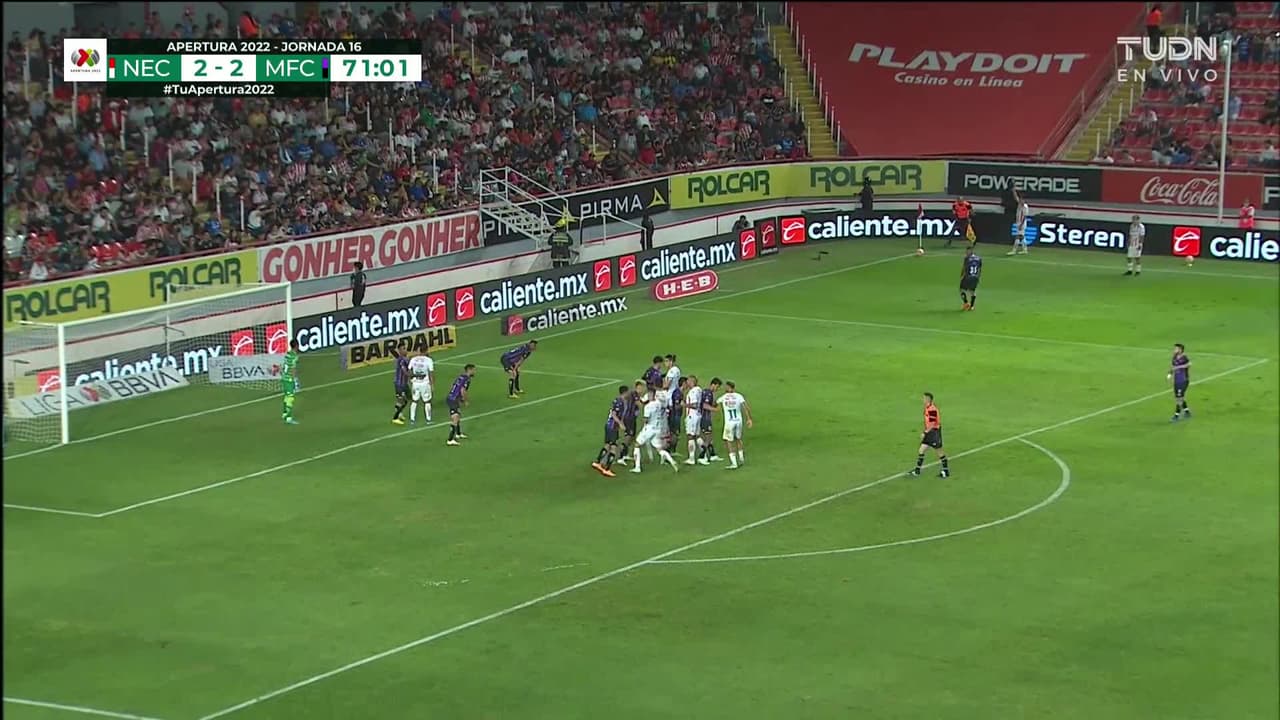 Tiro atajado raso al centro del arco. Juan Pablo Segovia (Necaxa) disparo de cabeza desde el centro del área. Asistencia de Fernando Madrigal con un centro al área.