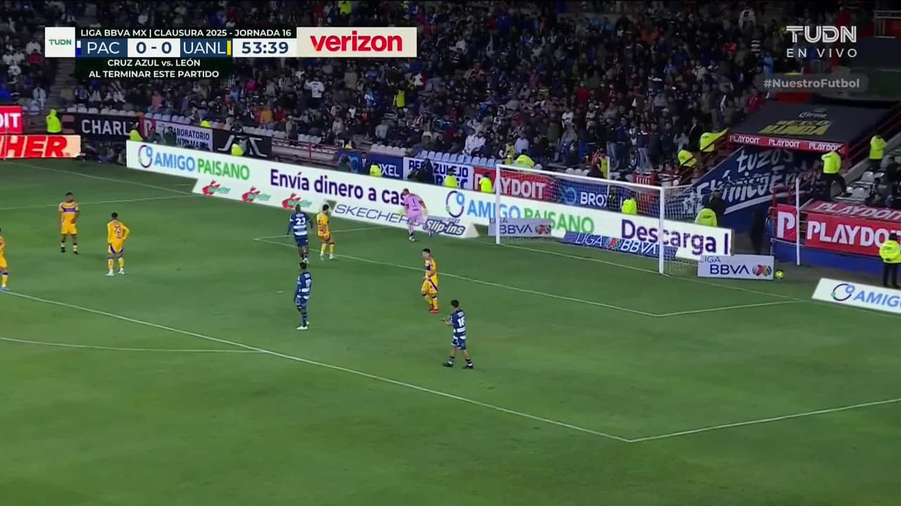 Tiro atajado. Juan Sigala (Pachuca) Disparo con la derecha desde fuera del área.