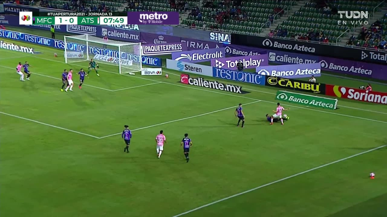 Tiro atajado raso al centro del arco. Julián Quiñones (Atlas) disparo de cabeza desde el centro del área. Asistencia de Jairo Torres con un centro al área.