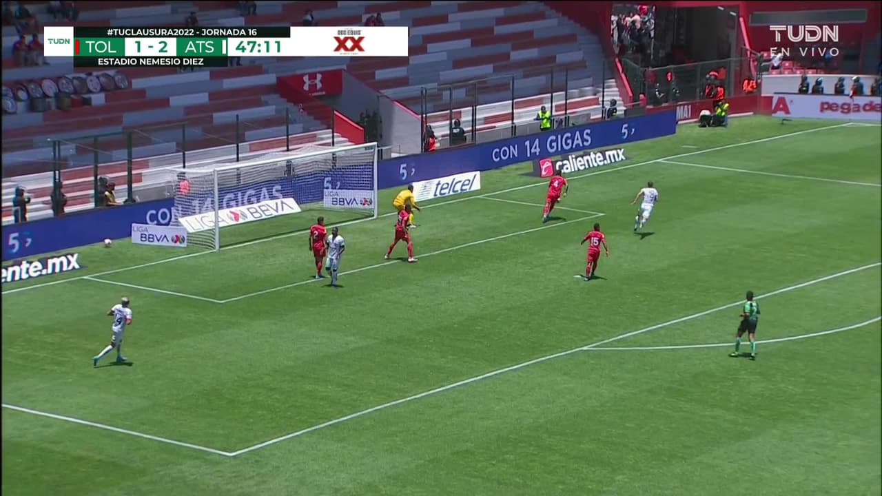Tiro atajado al ángulo superior derecho. Julián Quiñones (Atlas) disparo de cabeza desde el centro del área. Asistencia de Jairo Torres con un centro al área.