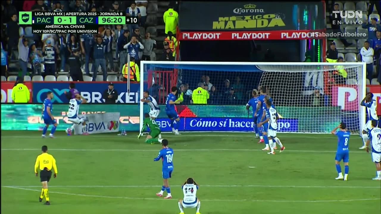 Tiro atajado junto al lado derecho de la portería. Kenedy (Pachuca) zurdazo desde fuera del área.