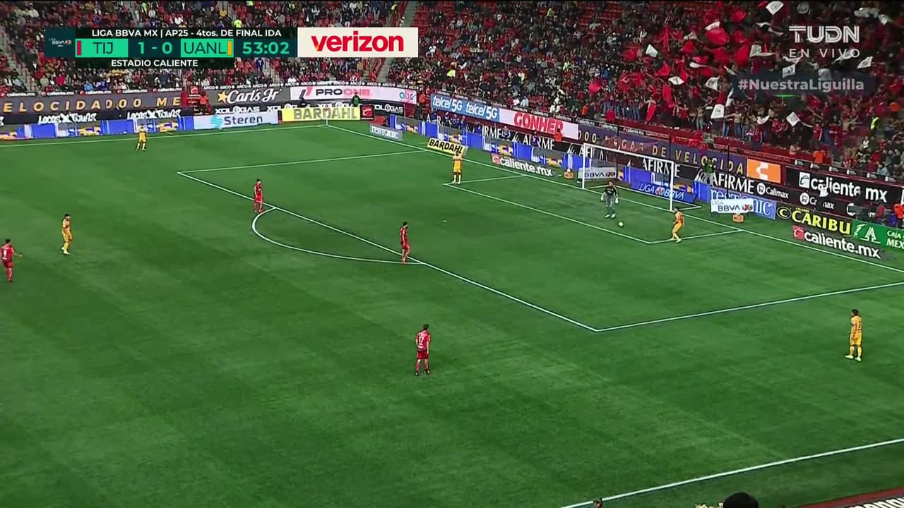Tiro atajado junto al lado derecho de la portería. Kevin Castañeda (Club Tijuana) Disparo con la derecha desde muy lejos y sin ángulo. Asistencia de Ramiro Árciga.