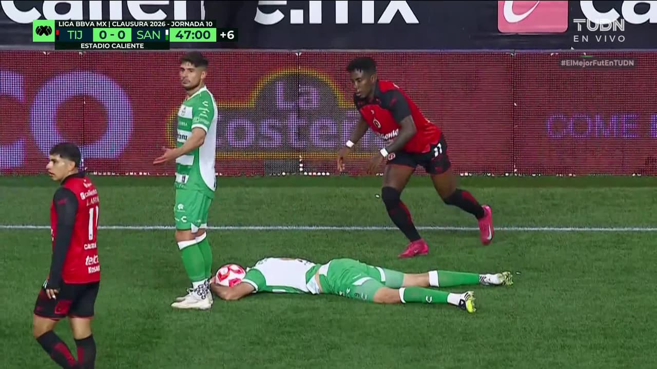 Tiro atajado. Kevin Castañeda (Club Tijuana) Disparo con la derecha desde el lado derecho dentro del área.