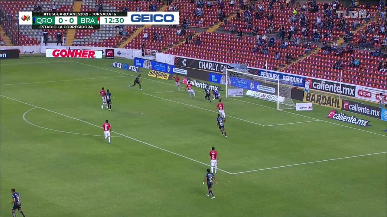 Tiro atajado por abajo a la izquierda. Kevin Ramírez (Querétaro) zurdazo desde el lado izquierdo dentro del área. Asistencia de Omar Mendoza con un centro al área.