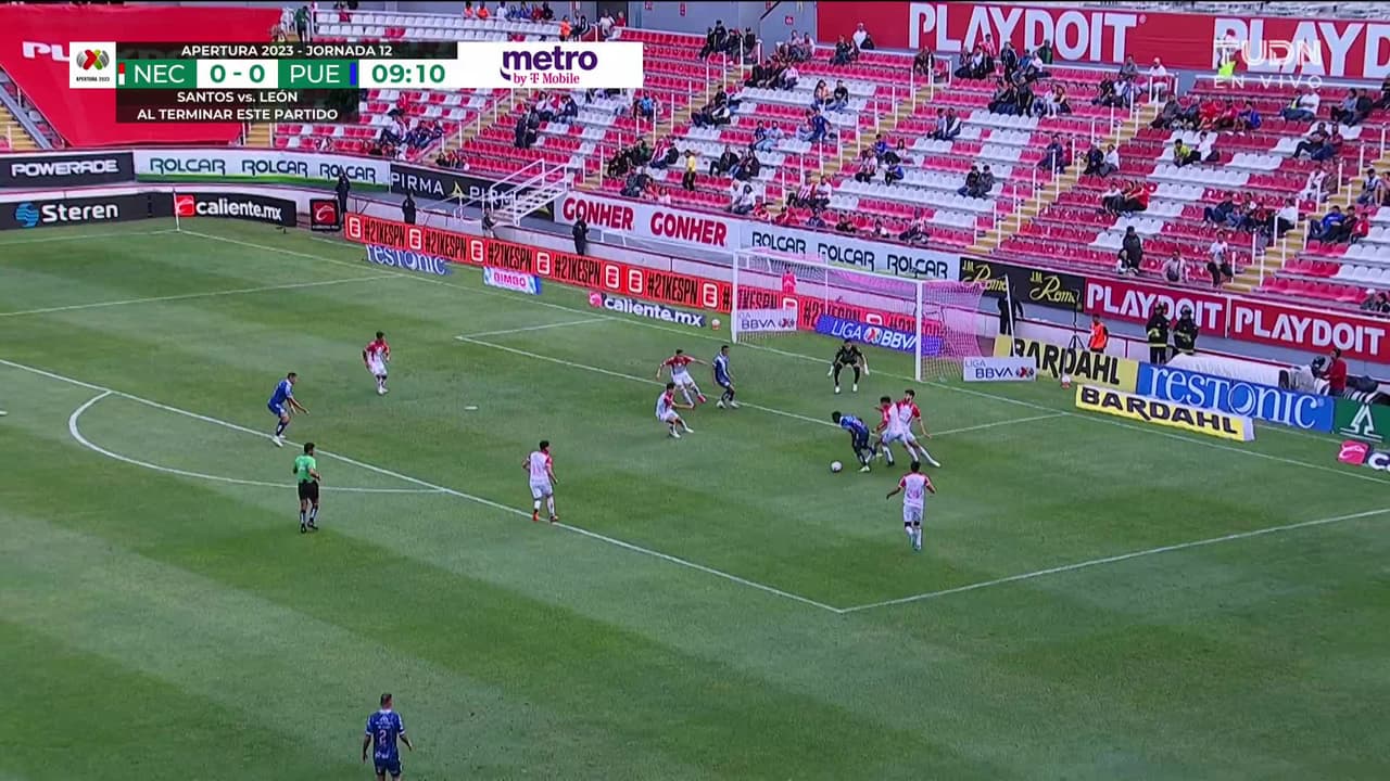 Tiro atajado raso al centro del arco. Kevin Velasco (Puebla) zurdazo desde el lado derecho dentro del área.