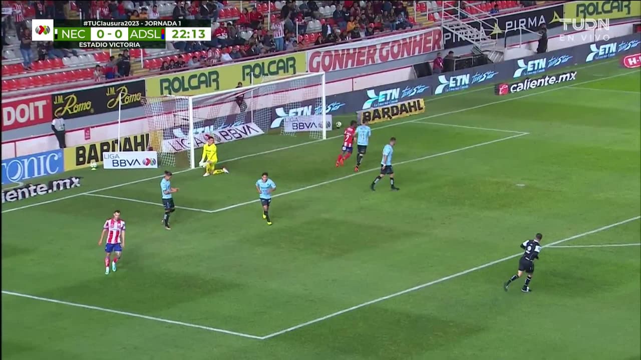 Tiro atajado por abajo a la izquierda. Léo Bonatini (Atlético San Luis) zurdazo desde el lado izquierdo dentro del área. Asistencia de Juan Manuel Sanabria pase largo.