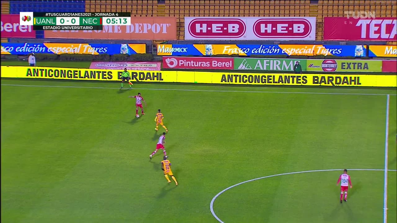 Tiro atajado junto al lado derecho de la portería. Leonardo Fernández (Tigres) zurdazo desde muy lejos y sin ángulo. Asistencia de Javier Aquino.