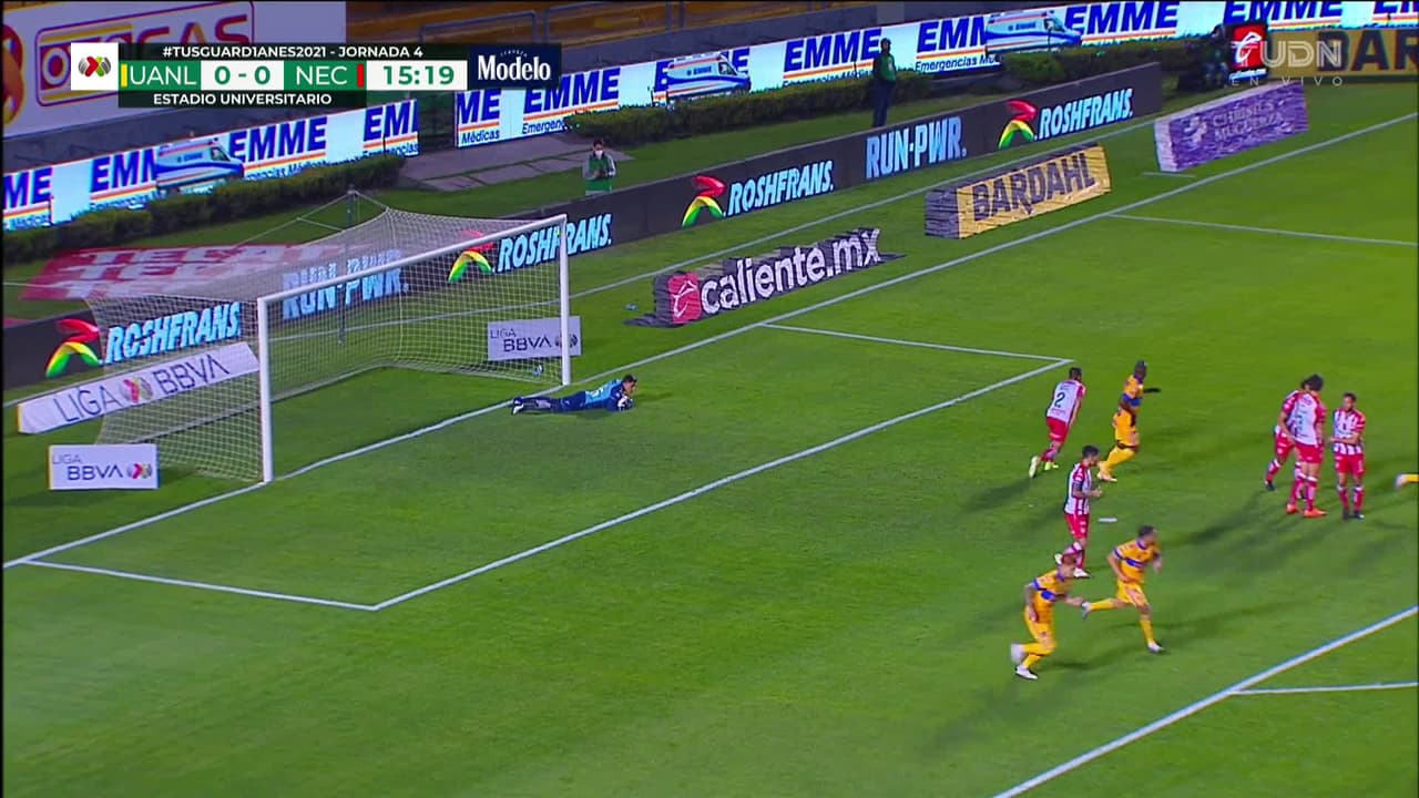 Tiro atajado junto al lado derecho de la portería. Leonardo Fernández (Tigres) zurdazo desde fuera del área.