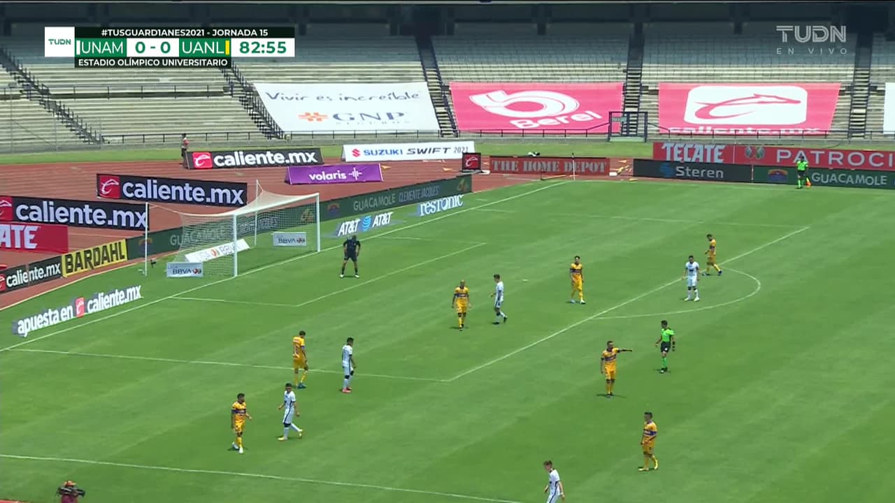 Tiro atajado al ángulo superior derecho. Leonardo Fernández (Tigres) zurdazo desde fuera del área. Asistencia de Javier Aquino.