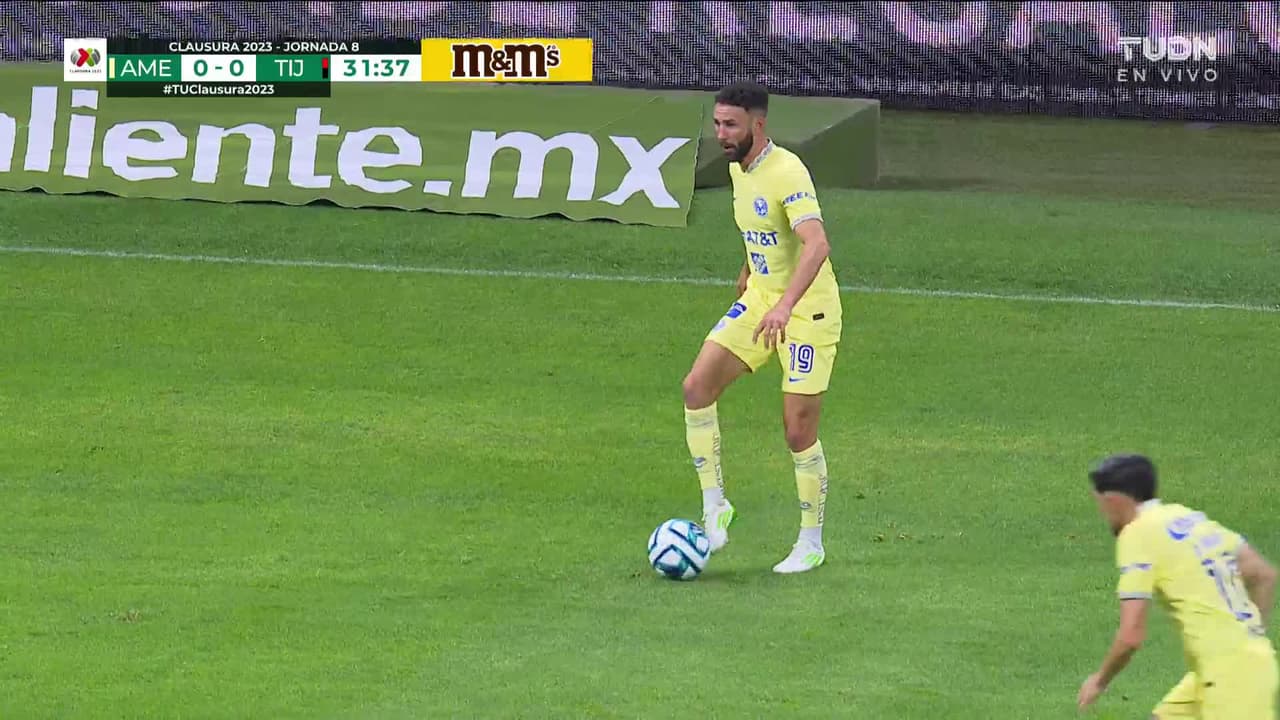 Tiro atajado. Leonardo Suárez (América) disparo de cabeza desde el centro del área.