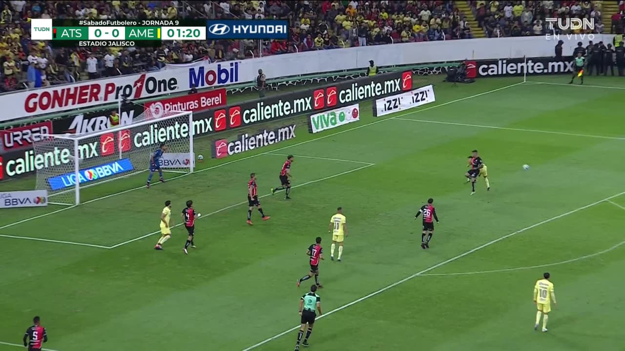 Tiro atajado. Leonardo Suárez (América) zurdazo desde fuera del área.