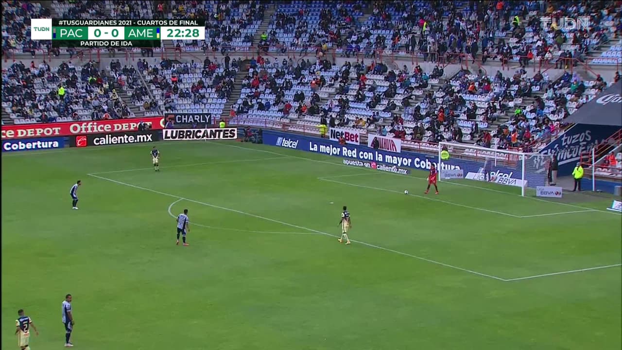 Tiro atajado junto al lado derecho de la portería. Leonardo Suárez (América) zurdazo desde el lado derecho dentro del área. Asistencia de Henry Martín con un pase de cabeza.