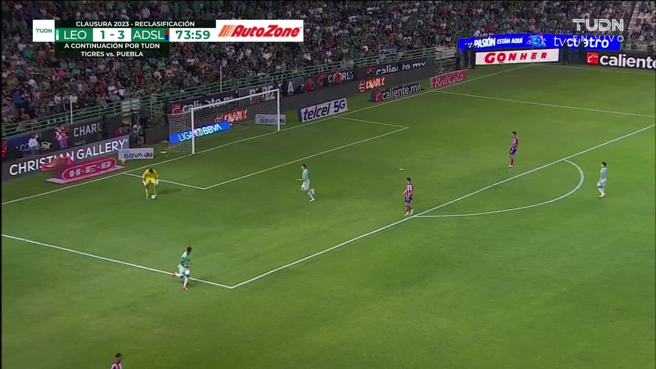 Tiro atajado raso al centro del arco. Lucas Di Yorio (León) Disparo con la derecha desde el lado derecho dentro del área. Asistencia de Ángel Mena.