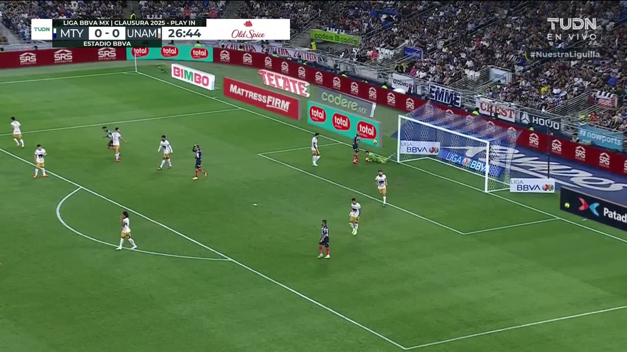 Tiro atajado. Lucas Ocampos (Monterrey) Disparo con la derecha desde fuera del área.