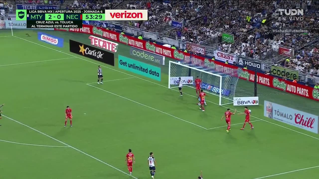 Tiro atajado al ángulo superior derecho. Lucas Ocampos (Monterrey) disparo de cabeza desde el centro del área. Asistencia de Érick Aguirre con un centro al área.