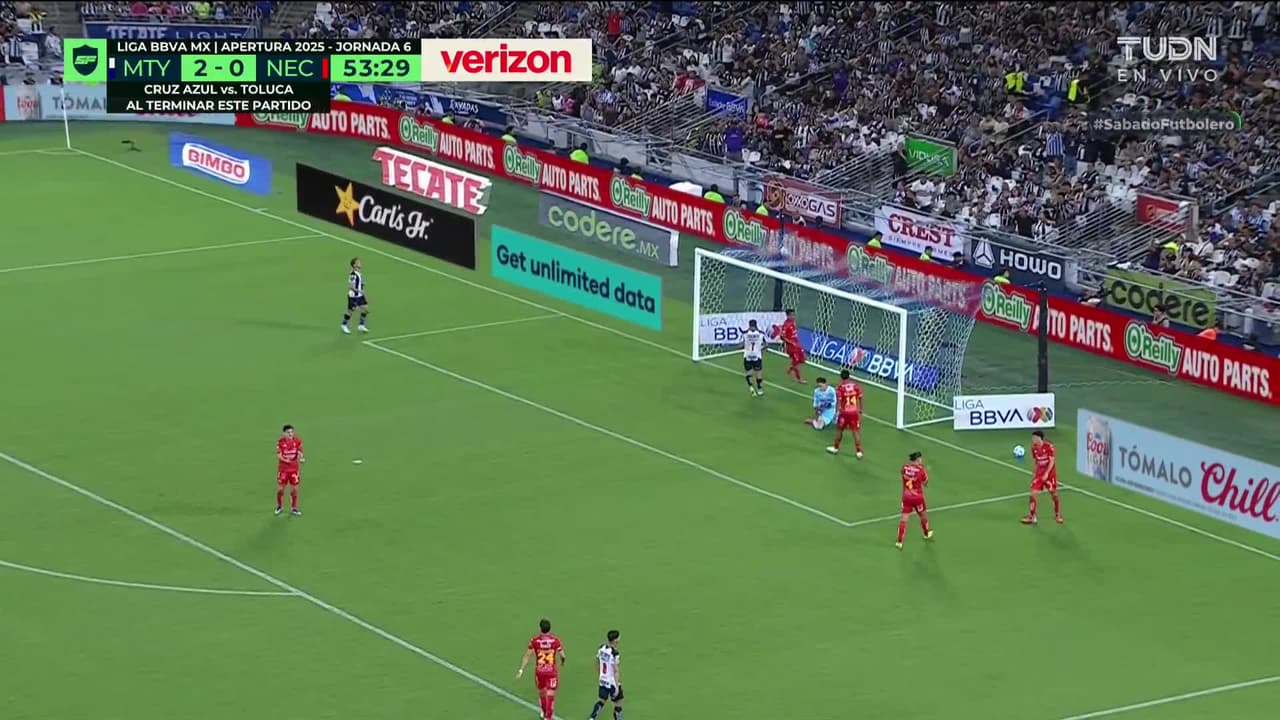 Tiro atajado. Lucas Ocampos (Monterrey) disparo de cabeza a quemarropa desde el lado derecho.