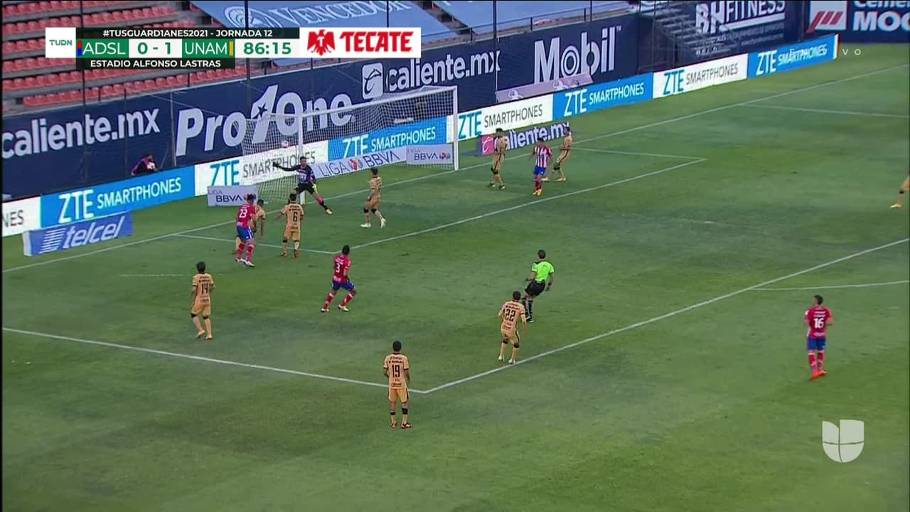 Tiro atajado raso al centro del arco. Lucas Passerini (Atlético San Luis) zurdazo sin ángulo desde la izquierda. Asistencia de Dionicio Escalante.