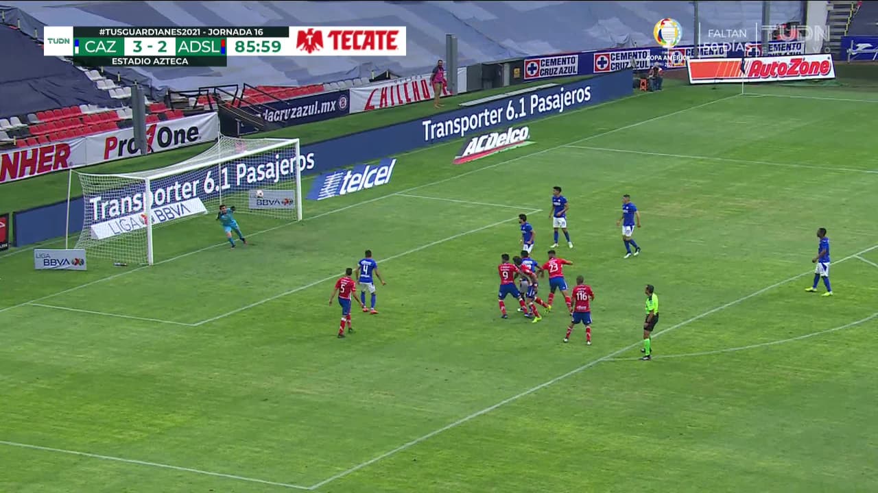 Tiro atajado al ángulo superior derecho. Lucas Passerini (Atlético San Luis) disparo de cabeza desde el centro del área. Asistencia de John Duque con un centro al área.
