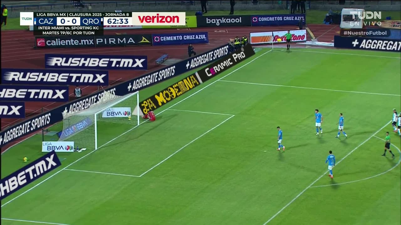 Tiro atajado junto al lado derecho de la portería. Lucas Rodríguez (Querétaro) zurdazo desde fuera del área. Asistencia de Josué Colmán pase largo.