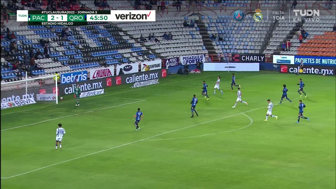 Tiro atajado raso al centro del arco. Luis Chávez (Pachuca) zurdazo desde fuera del área. Asistencia de Avilés Hurtado.