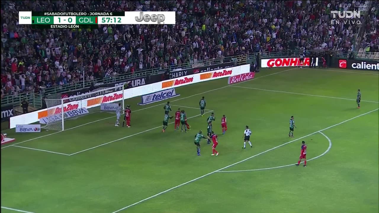 Tiro atajado Por arriba en el centro del arco. Luis Olivas (Chivas ) zurdazo desde fuera del área. Asistencia de Ángel Zaldívar.
