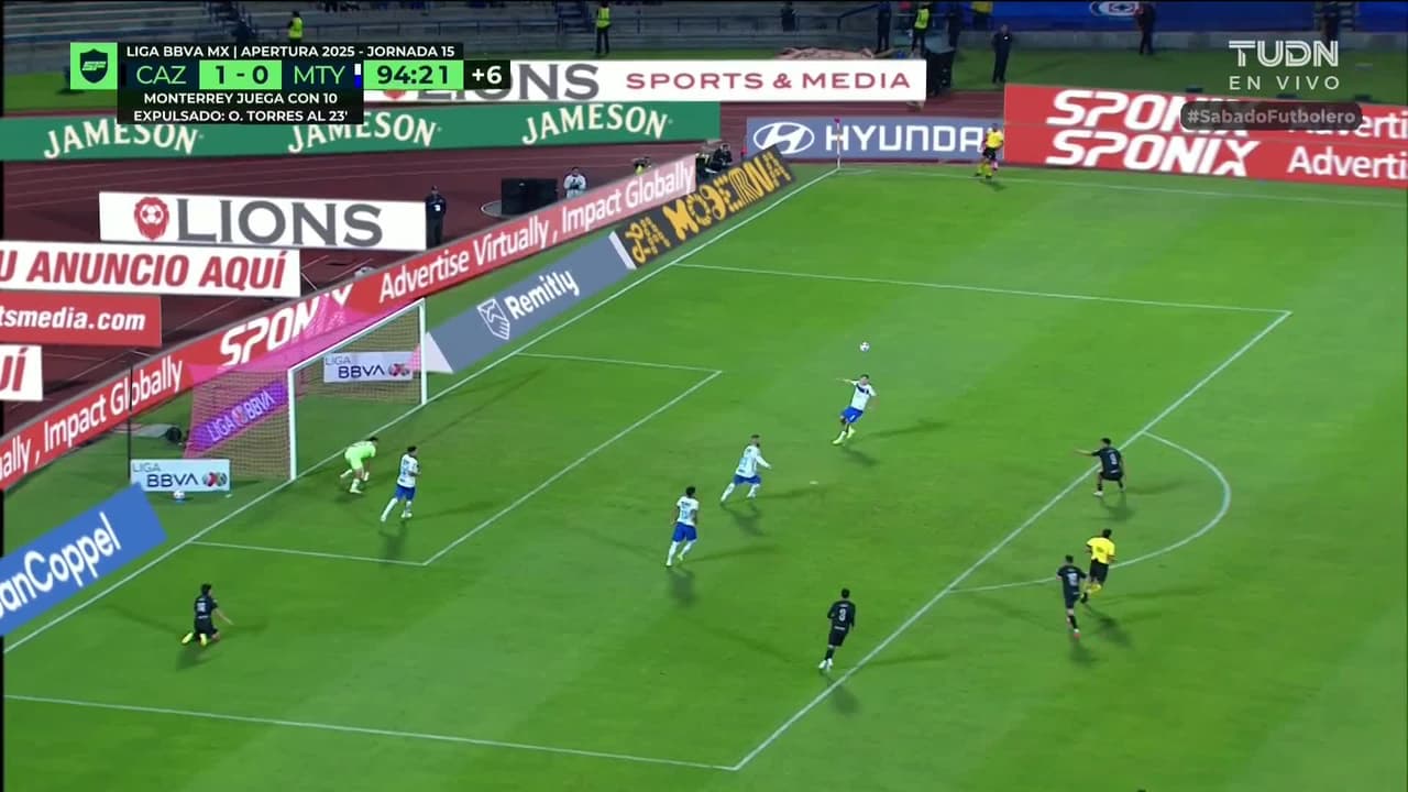 Tiro atajado Por arriba en el centro del arco. Luka Romero (Cruz Azul) zurdazo desde el lado izquierdo dentro del área. Asistencia de Omar Campos.