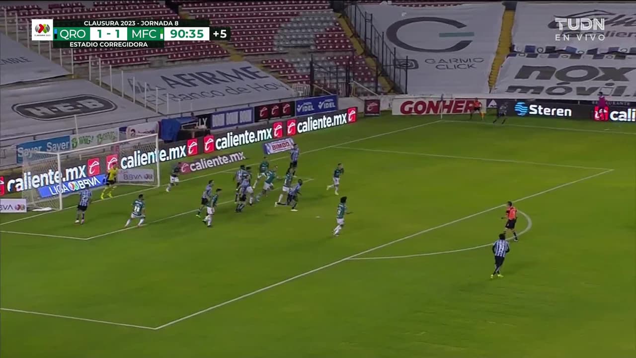Tiro atajado raso al centro del arco. Manuel Duarte (Querétaro) zurdazo desde más de 30 metros.