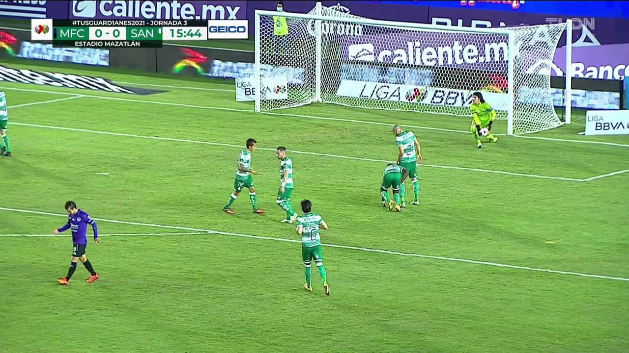Tiro atajado junto al lado derecho de la portería. Manuel Pérez (Mazatlán FC) zurdazo desde fuera del área. Asistencia de Luis Mendoza.