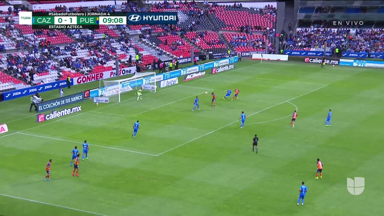 Tiro atajado Por arriba en el centro del arco. Martín Barragán (Puebla) disparo de cabeza desde el centro del área. Asistencia de Ivo Vázquez con un centro al área.