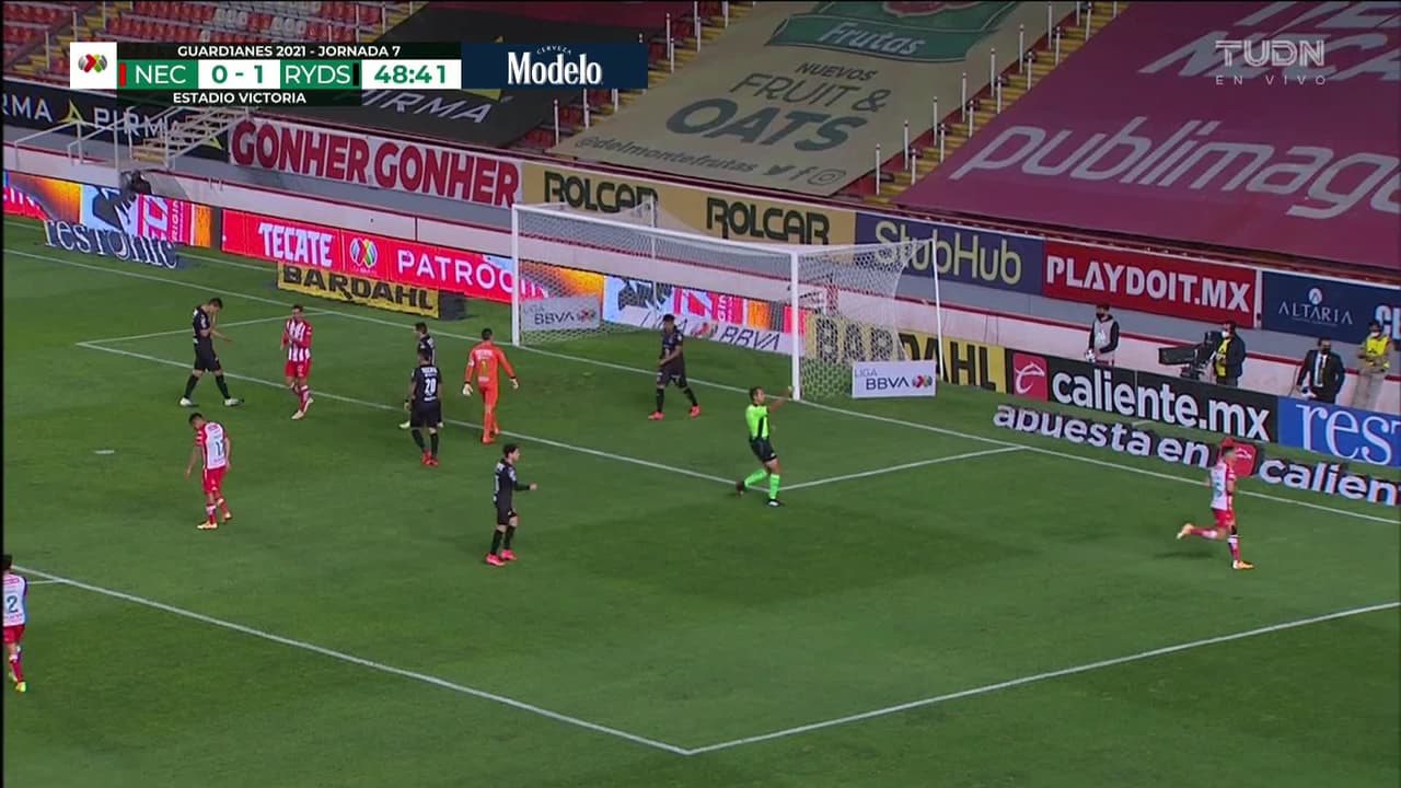 Tiro atajado junto al lado derecho de la portería. Martín Barragán (Necaxa) zurdazo desde el lado derecho dentro del área. Asistencia de Idekel Domínguez pase largo.