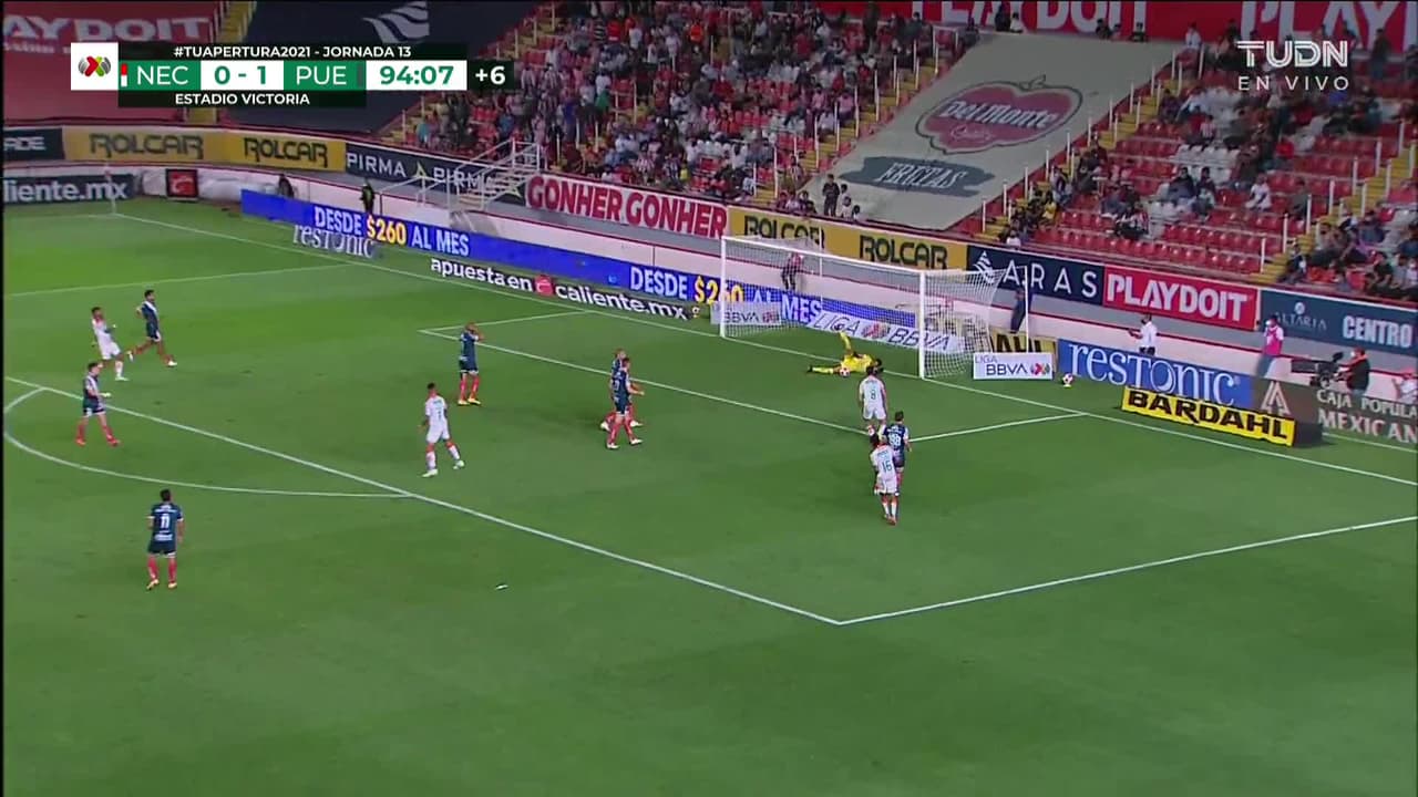 Tiro atajado Por arriba en el centro del arco. Mauro Quiroga (Necaxa) disparo de cabeza desde el centro del área. Asistencia de Jesús Escoboza con un centro al área.