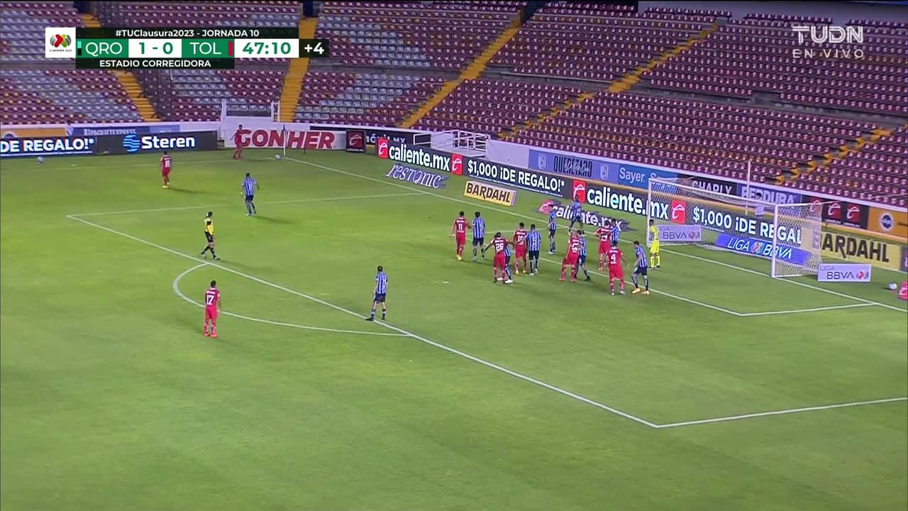Tiro atajado raso al centro del arco. Maximiliano Araújo (Toluca) Disparo con la derecha desde el lado derecho dentro del área.