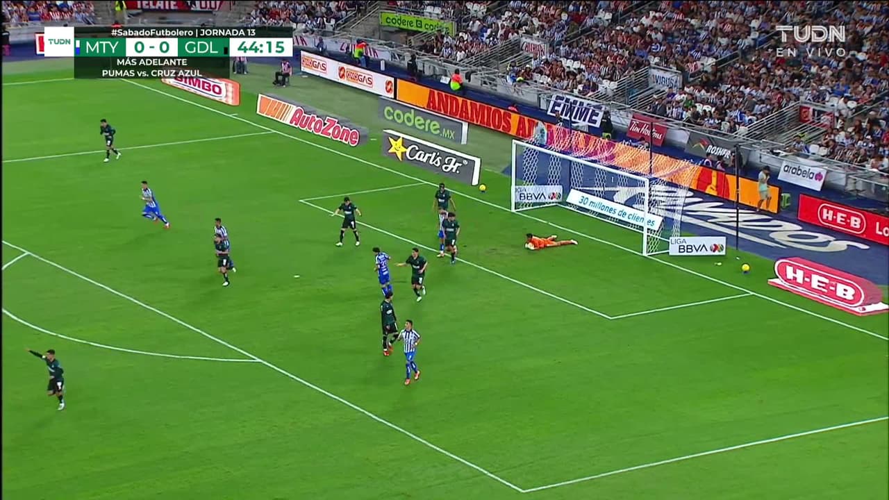 Tiro atajado raso al centro del arco. Maximiliano Meza (Monterrey) disparo de cabeza desde el centro del área. Asistencia de Sergio Canales con un centro al área.