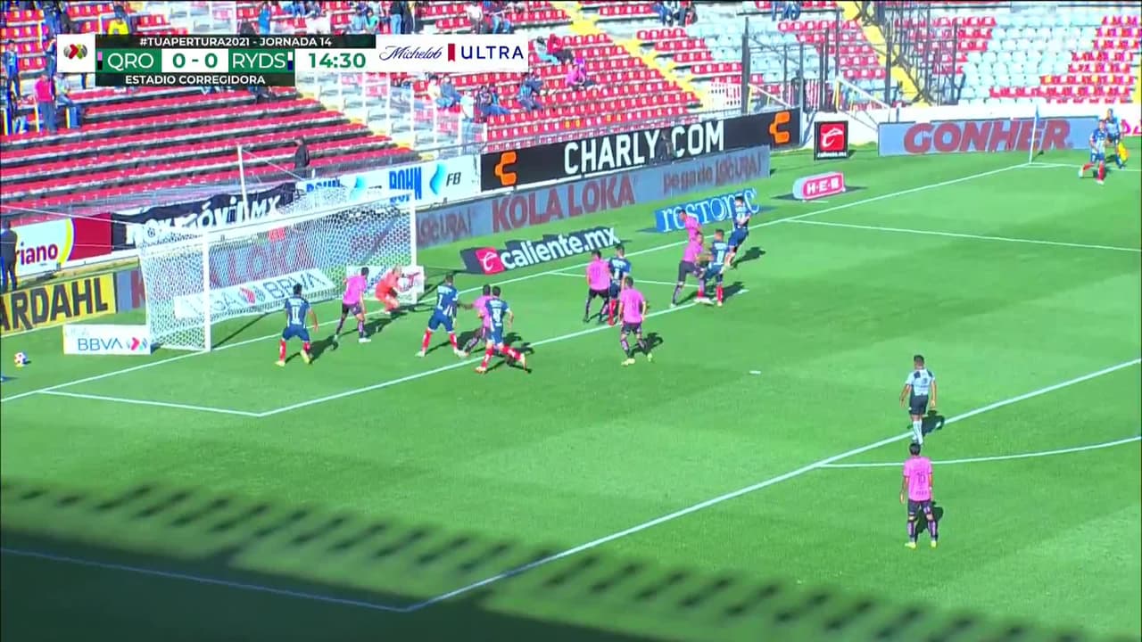 Tiro atajado. Maximiliano Meza (Monterrey) disparo de cabeza desde el centro del área.