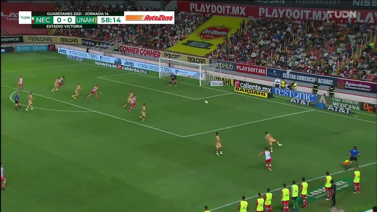 Tiro atajado. Maximiliano Salas (Necaxa) disparo de cabeza desde el centro del área.