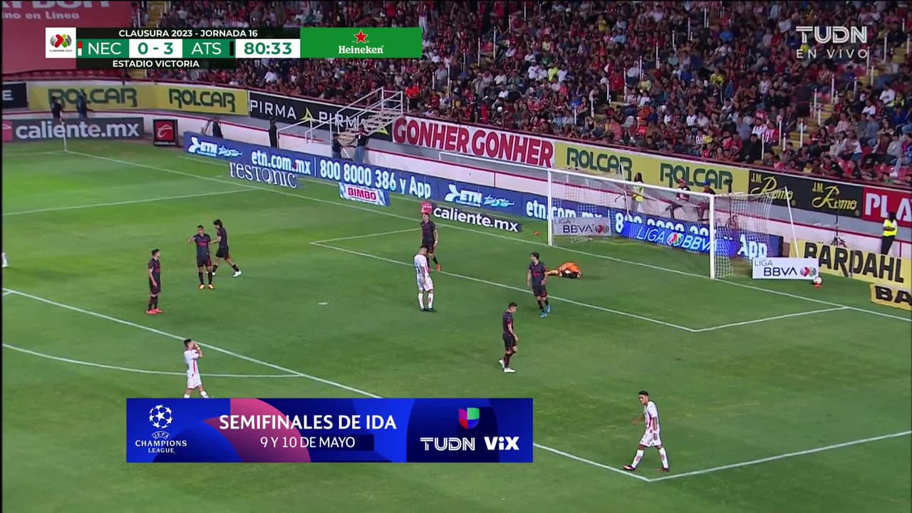 Tiro atajado junto al lado derecho de la portería. Maximiliano Silvera (Necaxa) zurdazo desde el centro del área. Asistencia de Fernando Madrigal.